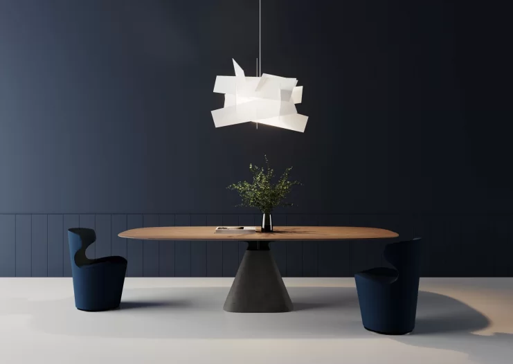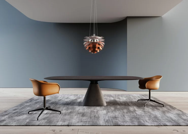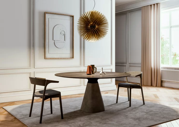Hier stösst niemand an die Tischkante. Bootsförmig, rechteckoval mit sanft abgerundeten Ecken oder neu auch in rund präsentiert sich der BRIDGE Tisch. Die feine Massivholzplatte brilliert wahlweise in Eiche oder in Schwarznuss und wird von einem Stahlelement aus der Brückenarchitektur gehalten. Das proportional feinst abgestimmte Untergestell aus einem Betonhohlkörper nimmt die Form der Tischplatte auf. Ein eleganter Begleiter, ein wahres Statement, im Wohn- wie im Objektbereich.