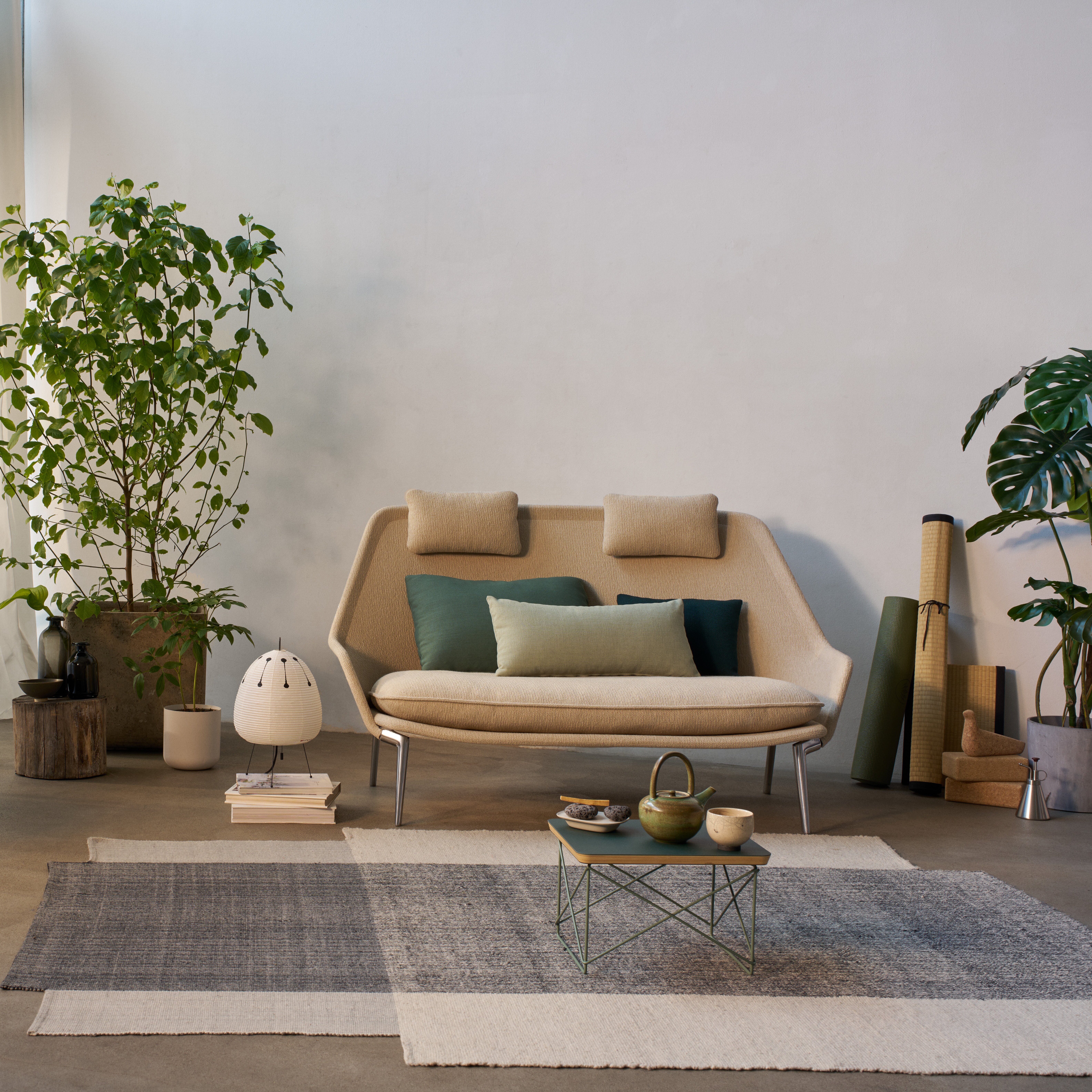 Seine Konstruktion mit dem über einen Stahlrohrrahmen gespannten Stoff Flocca macht es möglich, dass dieses kleinste Vitra-Sofa trotz kompakter Aussenmasse zwei Personen angenehm Platz bietet. Lose aufgelegte Sitzkissen, zwei Nackenkissen und drei konfigurierbare Rückenkissen aus der Kollektion der Vitra Cushions sorgen für weichen Komfort. So wird das Slow Sofa zum Lieblingsplatz, um sich darin aus der Hektik des Alltags zurückzuziehen. Das Slow Sofa ist leicht und kann darum einfach umplatziert werden.
