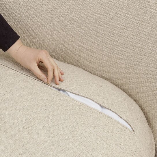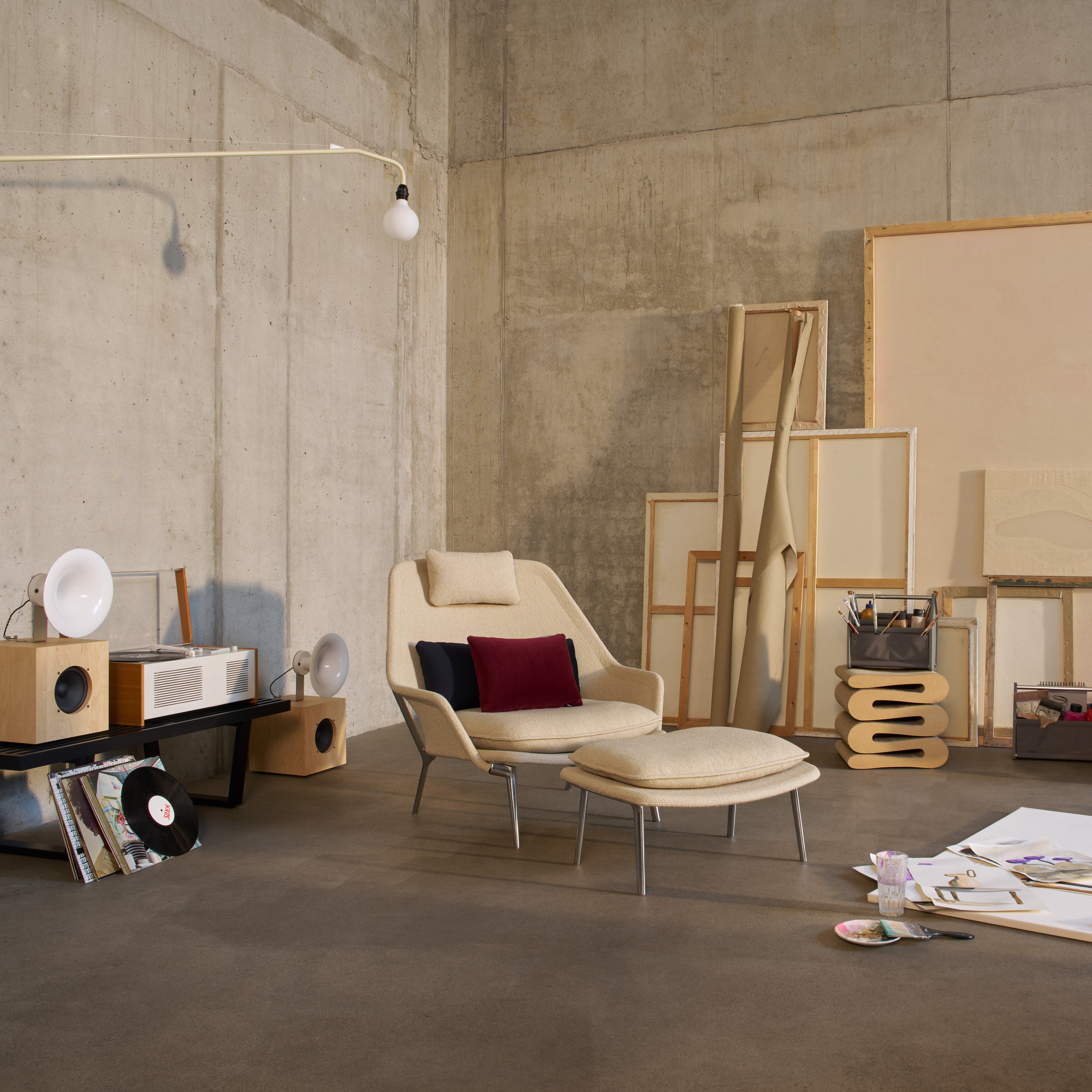 Der Bouclé-Stoff Flocca verleiht dem Sessel eine gemütliche Note. In Kombination mit einem Nackenkissen und mit Rückenkissen aus der Kollektion der Vitra Cushions bietet der Slow Chair weichen, einladenden.