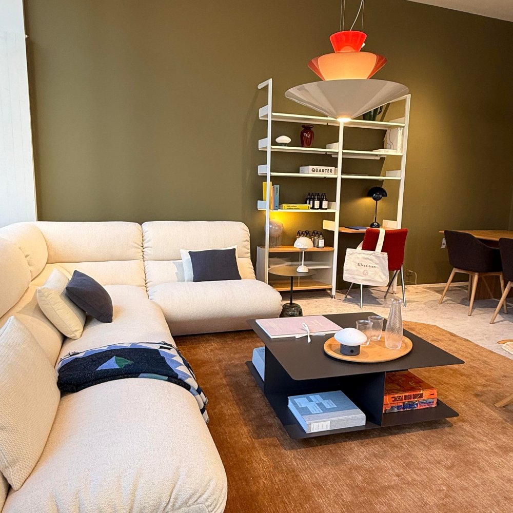 Eines von vielen Highlights aus der Ausstellung ist das Rombe Regalsystem. Rombe vereint Skulptur und Funktionalität und ist ein modulares Regalsystem, das vom Londoner Studio Industrial Facility für &Tradition entworfen wurde. Das System wurde mit großem Respekt für die Erhaltung der Innenarchitektur entwickelt und ist flexibel und auf moderne Bedürfnisse zugeschnitten. Das Rombe Regal verleiht dem systemischen Design eine warme Note und ist in 11 verschiedenen Anordnungen erhältlich, die um zusätzliche Fächer und Regalböden erweitert werden können, sodass es mit seiner Umgebung mitwachsen kann.
